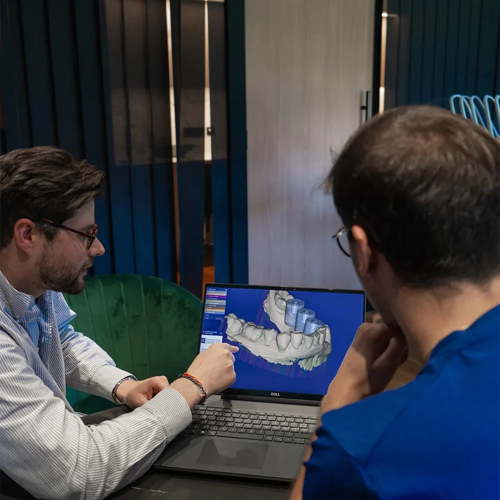 Grâce à une modélisation numérique 3D basée sur des fichiers STL et DICOM, chaque implant est planifié en tenant compte de l’anatomie du patient : densité osseuse, position des racines, nerfs ou sinus. Cette approche minimise les complications potentielles et renforce la sécurité de l’intervention.